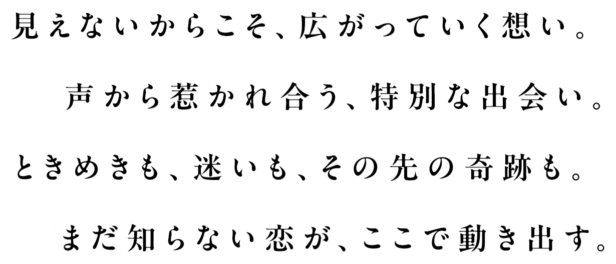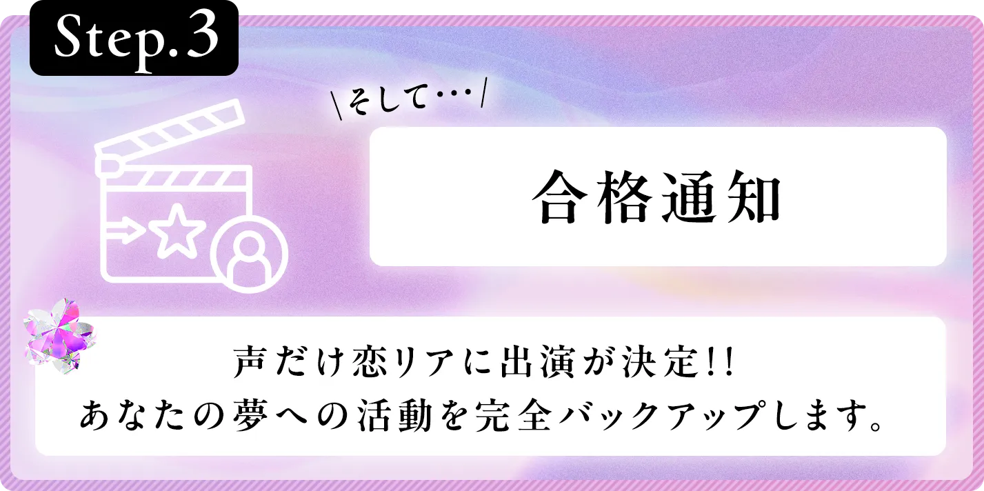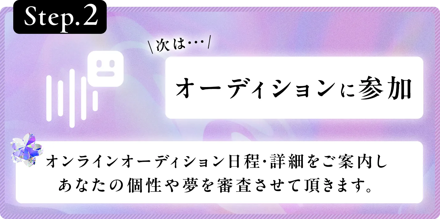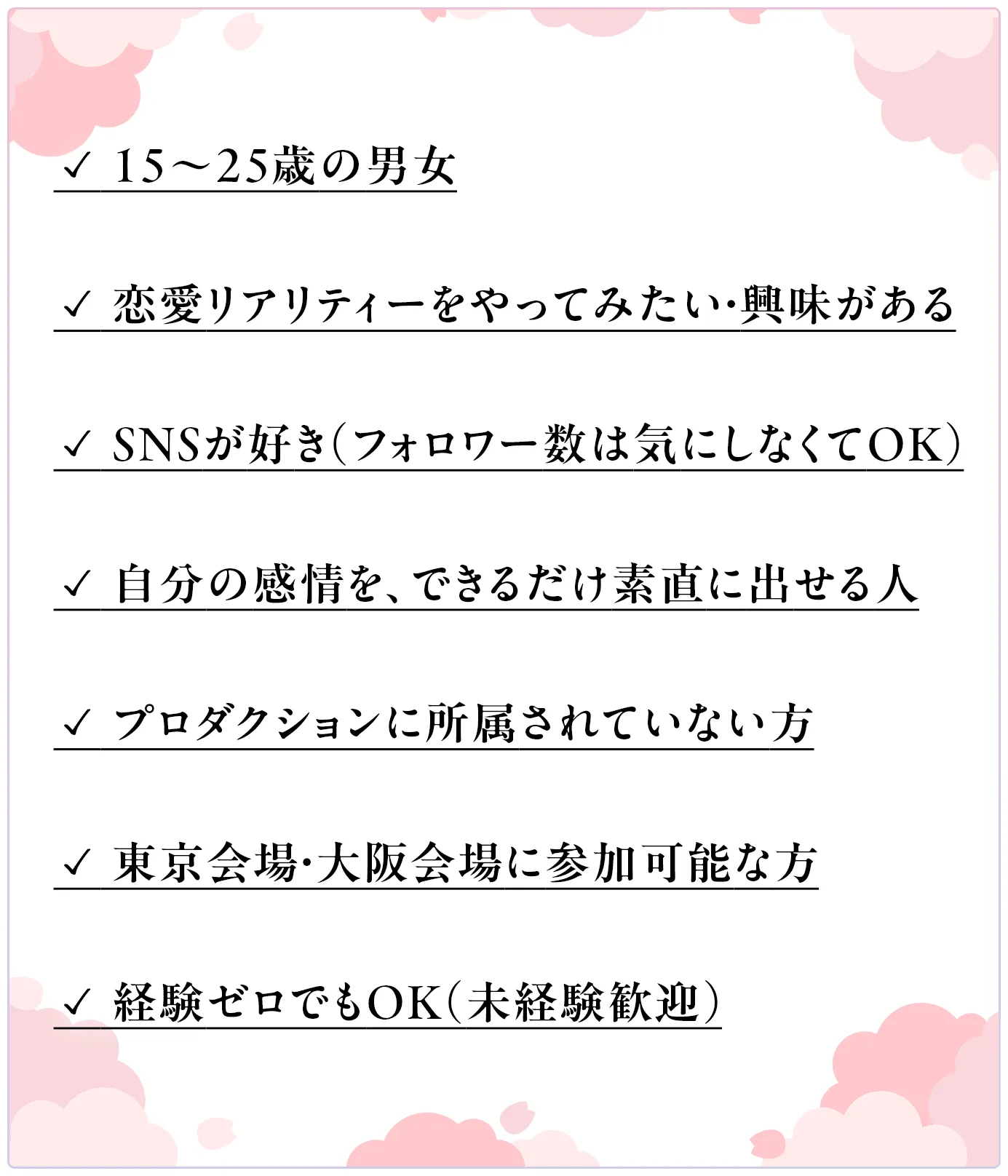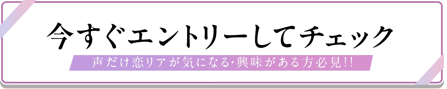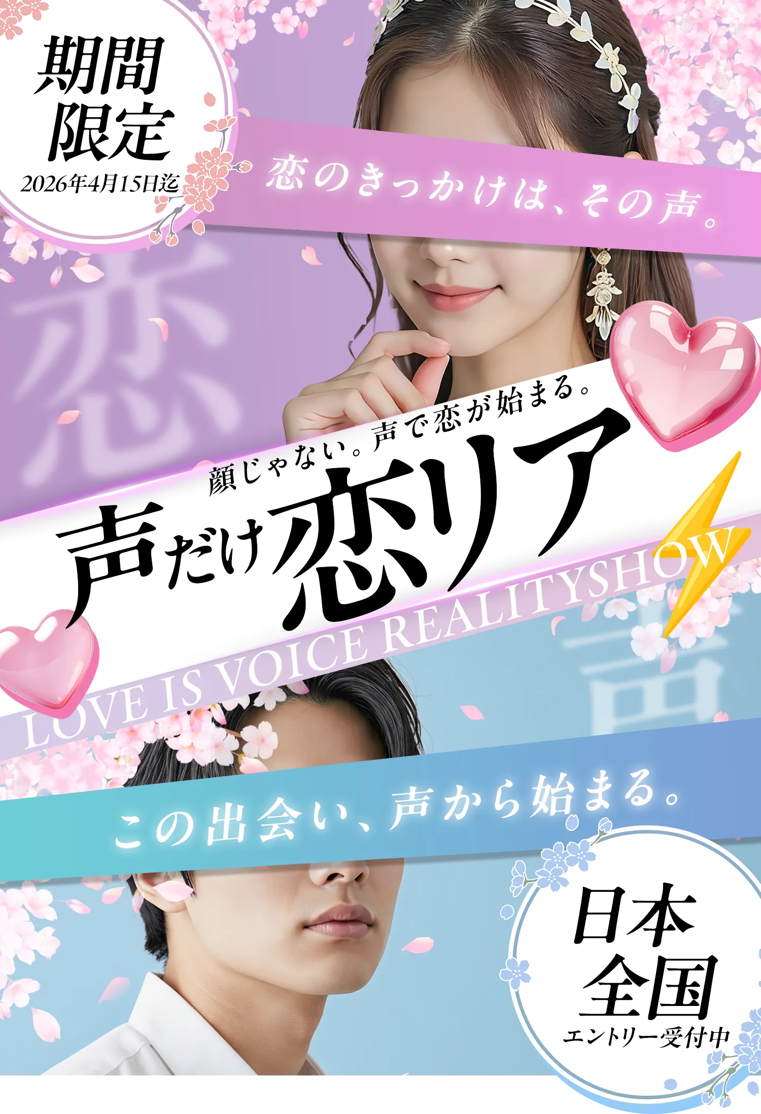 メニュー 声だけ恋リア参加のメリット 審査基準について 参加条件について 応募の流れ 注意事項について 番組出演を懸けたオーディション開催中!! 審査過程の交通費・諸費は個人負担となります 未成年の方は保護者の同意の上、ご応募下さい 必ず候補者の同意を得てご応募ください LINEで連絡が取れない場合は、選考ストップ オーディション時は録音・撮影は禁止です 事務所への直接訪問は一切お断りしております エントリー前の疑問点・相談など 気になる点はお気軽にお問合せ下さい お問い合わせはこちら 住所、電話番号、氏名、性別、年齢(以下「個人情報」といいます。)はANNIN運営事務局が管理します。お客様の個人情報は、本キャンペーンの当選者への連絡の目的で利用し、それ以外の目的では使用致しません。また、お客様の個人情報をお客様の同意なしに業務委託先以外の第三者に開示・提供することはありません。(法令等により開示を求められた場合を除きます) 個人情報開示訂正等のお問い合わせはANNIN事業部info@annin-hp.comまでお願い致します。 プライバシーポリシー ©ANNIN All rights reserved.